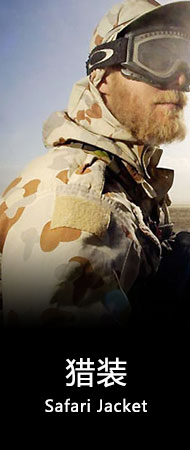 獵裝的面料選用范圍廣,天然纖維,如棉麻、棉麻混紡;合成纖維,如滌綸、中長(zhǎng)、的卡等均可制作。春夏獵裝選用棉滌或者麻棉織物為宜。顏色以適于隱藏的叢林迷彩為主!