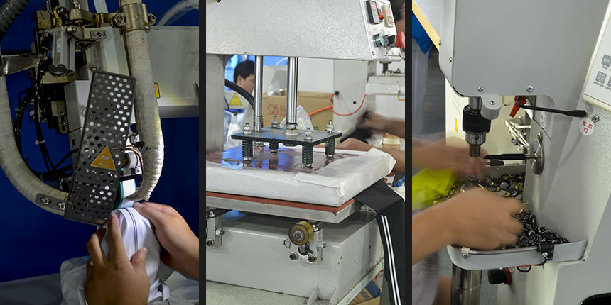 專業(yè)設(shè)備200條臺,包括重機(jī)電腦平車、刀車、 鐳射切割機(jī)、壓膠機(jī)、無鏠熱壓機(jī)、驗(yàn)針機(jī)、釘扣機(jī)、套結(jié)機(jī)、鎖邊機(jī)、刀切機(jī)、鎖眼機(jī)、測水壓機(jī)等等。