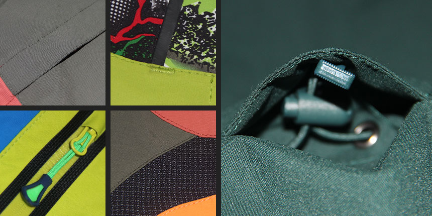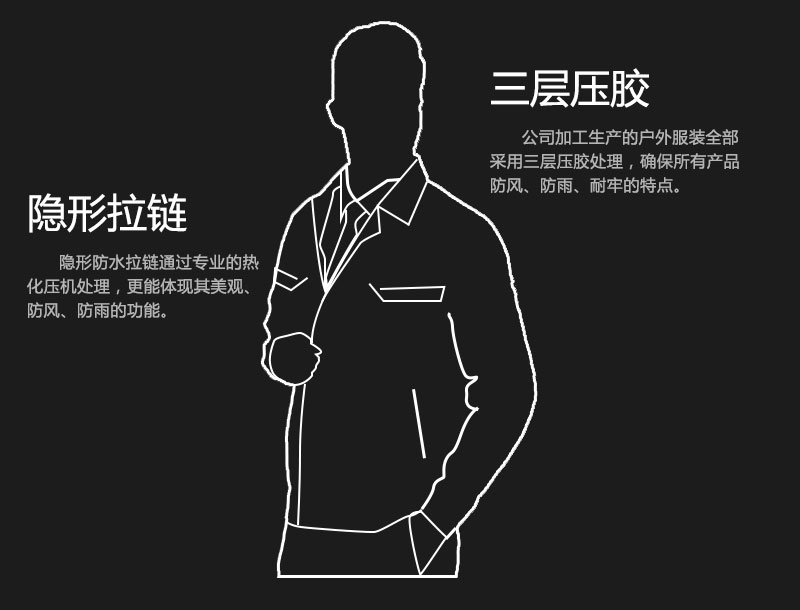肩部、肘部加耐磨層;內(nèi)中下部有防風(fēng)腳,以防止風(fēng)從下擺灌入衣內(nèi);腋下可配透氣拉鏈,在出汗較多的情況下可直接拉開透氣;內(nèi)置式帽子,以便在不用的時(shí)候可以收起。不同款式的配色設(shè)計(jì)、及特殊細(xì)節(jié)處理:如在袖口處有小掛扣,等等。